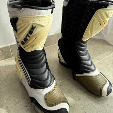 Ixon Kasumi motorcykelstøvler i størrelse 44. Støvlerne er sorte og konstrueret som vandtætte (rainproof construction). De har snøresystem med justeringshjul øverst på skaftet samt lynlås i siden for nem af- og påtagning. Overdelen er i tekstil og syntetisk materiale med forstærkninger flere steder. Indvendigt er der polstret for, som giver ekstra komfort omkring fod og ankel. Velegnet som beskyttende fodtøj til motorcykelkørsel i forskellige vejrforhold.