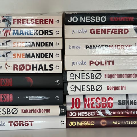 13 krimibøger af Jo Nesbø. På billedet ses blandt andet titler som "Frelseren", "Politi", "Snemanden", "Tørst", "Kniv" og flere andre. Bøgerne er i dansk udgave og egner sig til læsere af krimigenren, der ønsker flere bind samlet af samme forfatter.