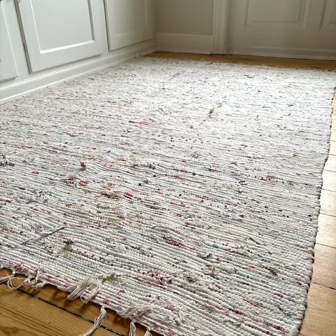 Gammelt svensk kludetæppe i lilla og lyse nuancer💜 Længde 140 cm, bredde 66 cm🩷 Vævet i plast🩶