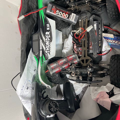 Kasse med 2 gamle RC biler el/nitro med diverse tilbehør. Til reparation eller reservedele.