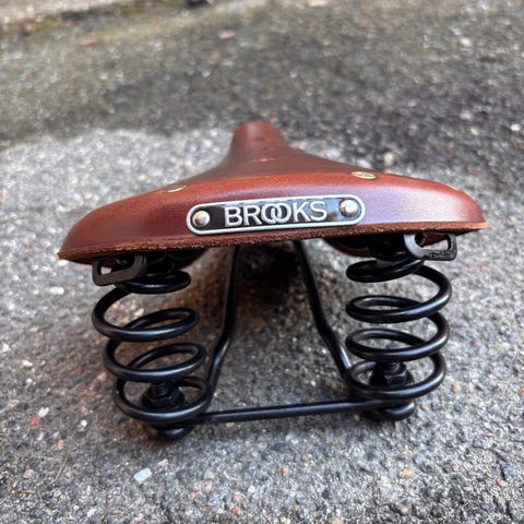 Brooks cykelsadel i brun læder med fjedrende understel i metal. Klassisk smalt design med nitter langs kanten og ventilationshuller i midten af sadlen. Egnet til montering på cykler, hvor der ønskes en traditionel lædersadel med fjedre for ekstra komfort. Velegnet til hverdagskørsel og længere ture på by- eller turcykel.