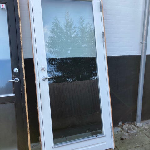 Yderdør med flere glasfelter. Døren har ramme i grå nuance i vedligeholdelsesfrit materiale udvendigt og hvid træ indvendigt. Udstyret med dørgreb og låsekasse, lås medfølger ikke.