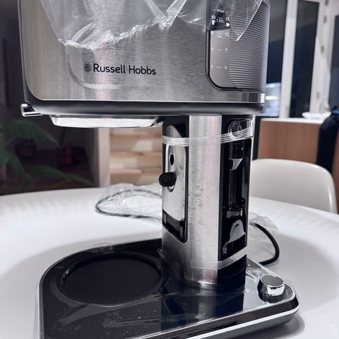 Russell Hobbs kaffemaskine med indbygget kværn, som kan indstilles på forskellige måder med styrke, hvorgrov eller fint bønnerne skal kværnes, kværnen kan også slåes fra så der kan bruges formalet kaffe.