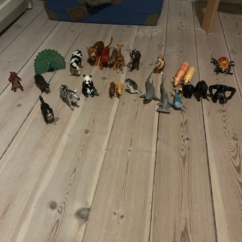 Plastik dyrefigurer og dinosaurfigurer blandet lot