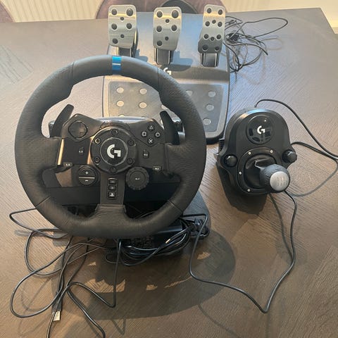 Logitech G920 racerrat med pedaler og separat gearskifter i sort. Sættet består af et rat med knapper og styrepind, et pedalmodul med tre pedaler (kobling, bremse og speeder) samt en manuel gearskifter med H‑mønster. Velegnet til bilspil og racingsimulationer, hvor der ønskes mere præcis styring og pedalbetjening end med en standard controller.