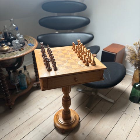 Skakbord i træ med indlagt skakbræt i bordpladen. Rektangulær bordplade med skakfelter i to trænuancer. Bordet har fire slanke ben. Medfølgende skakbrikker i to farver, opbevaret i rum i bordet. Velegnet som spillebord og lille sofabord.