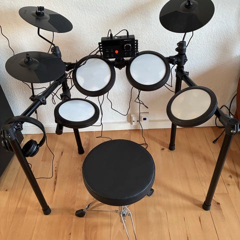 Hi-Hat Stativ samt Stortromme Pedal set på billeder er ikke inkluderet og ej heller til salg. Trommesæt er købt den 13/11-2025 incl. 3 års Garanti. Har gemt de Originale papkasser.