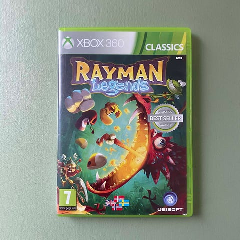 Ubisoft Rayman Legends Xbox 360 spil. Fysisk udgave i standard Xbox 360-plastcover med spil-disk og omslag. Platformspil med PEGI 7-mærkning, beregnet til Xbox 360-konsoller.