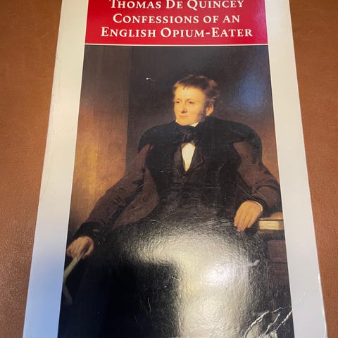 En engelsk opiumbrugers bekendelser, Thomas de Quincey, genre: roman, Bogen er en af verdenslitteraturens mest forunderlige og originale prosaværker, fordi forfatteren skrev bogen, mens han var narkoman.