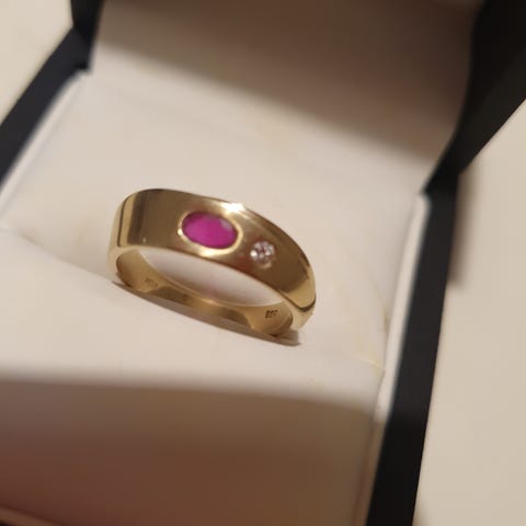 Yndig 14 kt guldring med blå safir. Håndlavet hos Guldsmed "By Marika". Denne er speciallavet, så der er lidt mere guld i end i den hun laver som standard.
