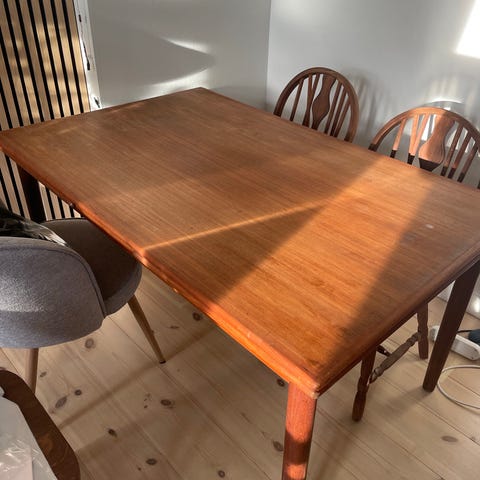 Fint bord i teak med hollandsk udtræk. H. 73 cm, B. 85 cm længde 128 cm + tillægsplader 2 x 45 cm. Fremstår velholdt, rengjort og nyolieret. Pris 2.900,- kroner