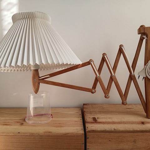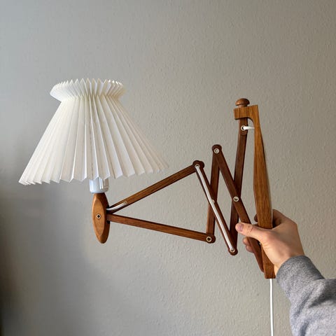 Le Klint sakselampe af egetræ. Den lille model. Skærm af papir som er i fin stand men er blevet lidt gulnet med tiden. Ny ledning. Kan leveres i Storkøbenhavn.