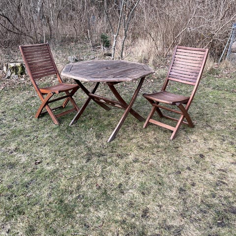 Sæt i teaktræ bestående af havebord med hollandsk udtræk. Længde 305/385 cm og 6 positionsstole med armlæn. Nogle af stolene trænger til opstramning.