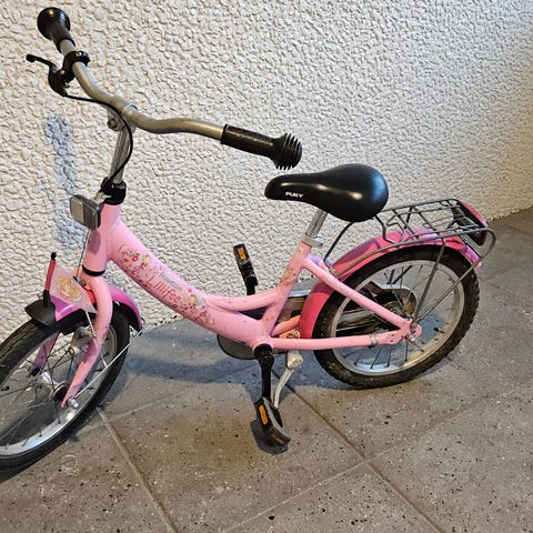 En rigtig god børnecykel med fodbremse og håndbremse, støttefod, kædebeskytter, katteøje, ringeklokke samt nye skærme foran og bagpå.