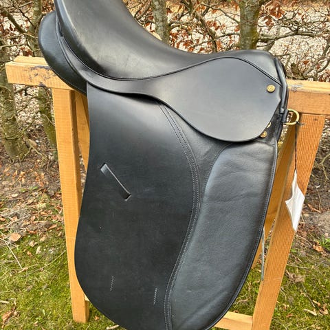 Dressursadel i brunt læder str 17”. Udstyret med stigremme og stigbøjler men mangler nye elastikker. Fremstillet i glat læder med synlige brugsspor, den ene knæpude er lidt foldet (se billede) og den har et mærke i sædet men begge ting vil rette sig ud med tiden og når den kommer i brug. Model Grand Gilbert