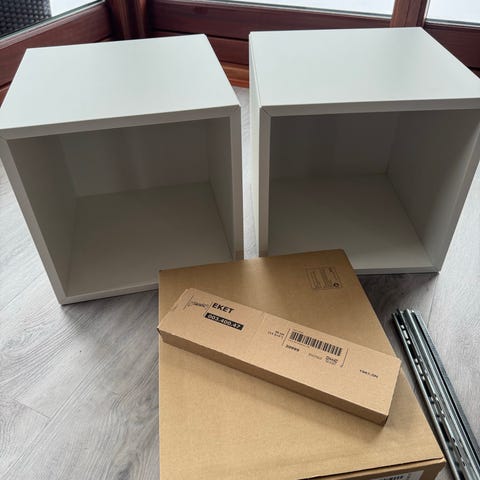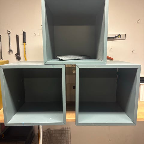 Tre Eket bogkasser fra Ikea 35/35/35 den blågrå og hvide sidder sammen og der er er skrige huller , men vi har beslaget her til
