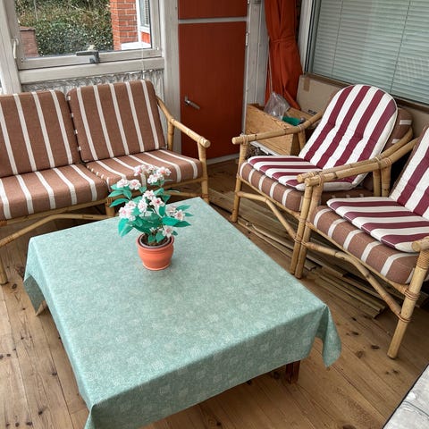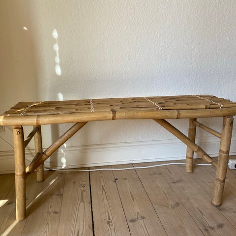 Gammel bambus havebænk, der er pæn som dekoration. Den er ikke stabil som den står nu til at sidde på. Jeg har skruet lidt, men vil man være sikker på den holder, så må man selv lige gå den efter. Den kan helt sikkert blive god igen.