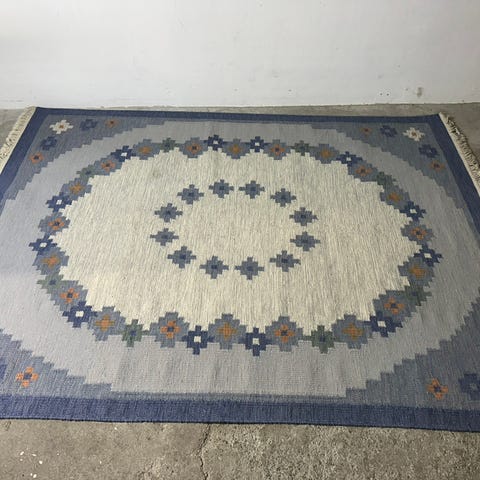 Flot og stort håndvævet Rölakan gulvtæppe - svensk moderne kelim - i uld sælges for 1500 kr. Tæppet et et retro tæppe, der kan vendes. Det et pænt og velholdt og måler ca. 170 x 254 cm inkl. frynser. Det har hvidlig bundfarve med stiliserede tulipaner i forskellige kønne farver. Obs: de skygger der ses på fotografierne skyldes fotografens tilstedeværelse.