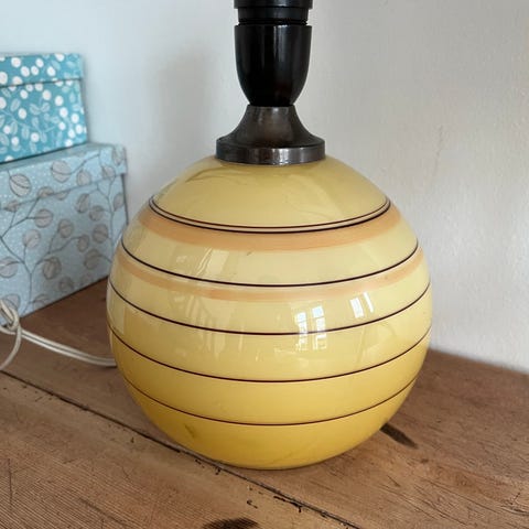 Anden bordlampe, Art deco-lampe med lyserød glasskærm. I sin tid købt hos Bruun Rasmussen, hvor det blev oplyst, at lampen er dansk og fra 1940’erne. Højde: ca. 22,5 cm.