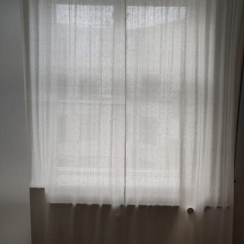 Hvidt let bomuldsgardin i tyndt stof. Gardinet er monteret på skinne med rynkebånd og hægter, og er lige til at hænge op. Alt følger med skinne på 2 M, 3 hængsler på 6 cm, kroge og glidere. På stoffet kan der forekomme enkelte små pletter, som vist på billeder, der er en enkel lidt mørk plet på midten, og nogle lysere pletter, der ikke ses tydeligt, da jeg først nu har bemærket dem. Ses ikke når gardinet er rullet til side om dagen. Gardinet hænger til den ene side.
