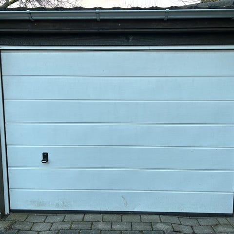 Gratis. Garage vippeporte lysgrå med grafitgråkarm og lås