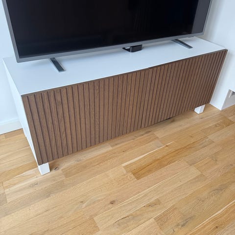 Jeg sælger dette TV-bord med lamelfronter i trælook og hvid top/sider.