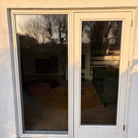 Rationel terrassedør træ/alu med fuldglas-fyldning og hvid ramme/karm. Døren er udført som udadgående terrassedør med 1 glasfelt.