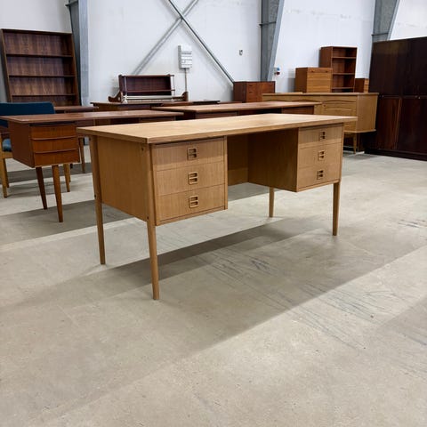 Flot skrivebord, egetræ, med 6 skuffer og synlig magasin/rum bagpå, så bordet både kan stå frit i rummet eller op ad væg. H. Kjænulf stil, men ikke stemplet. Kvalitetsmøbel fra Dansk møbelsnedker, design