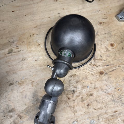 Smuk klassisk industriel Jielde i grøn metallisk ‘vespa’ farve. Original lampe og her med klemmebeslag til hylde eller bordplade.