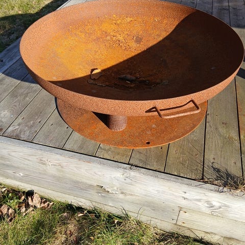 Rundt ildfad i stål med rustfarvet overflade. Fadet står på tre rørformede ben, som giver stabilitet på fast underlag. Velegnet som bålsted eller dekorativt element i haven eller på terrassen. Overfladen fremstår med patineret, rustent udseende