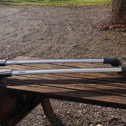 Sparsomt brugt komplet luksus tagbøjlesæt i aluminium fra Thule til nedfældede tagrælinger (flush rails).