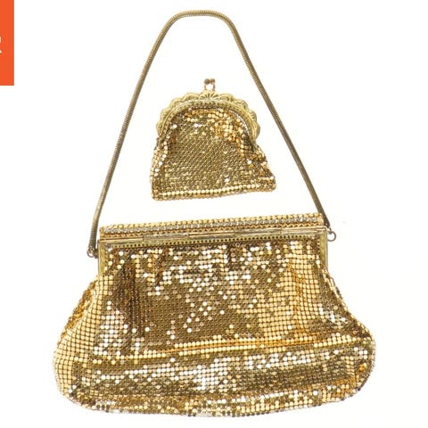 Guldfarvet skindtaske med tilhørende pung. Formodentlig fra 50'erne.
