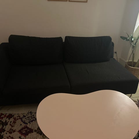 Sofa gives væk grundet flytning, har tydelige brugsspor i form af pletter.