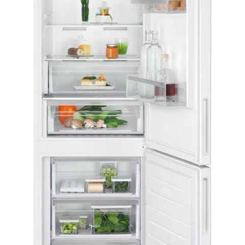 Electrolux køle-fryseskab i fritstående model med front i rustfrit stål. Skabet har køledel øverst og fryser nederst med flere skuffer. På fronten sidder et digitalt display til indstilling og aflæsning af temperatur i både køle- og frysedel. Indvendigt har køleskabet glashylder, grøntsagsskuffe og dørhylder til opbevaring af flasker og mindre varer. Fryserdelen har udtræksskuffer til overskuelig opbevaring af frostvarer.
