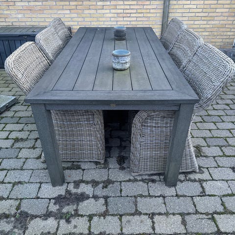Havebordssæt bestående af rektangulært havebord og 4 matchende stole i grå polyrattan. Bordet har plade med langsgående lameller og stel i metal. Stolene er kurvestole med armlæn og høj ryg, flettet i grå polyrattan. Sættet er egnet til udendørs brug på terrasse, altan eller i have.