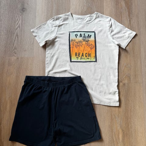 The New nattøj, lavet af økologisk bomuld. T-shirt & shorts. Er brugt en del men stadig blødt og fint. Se nærbillede af elastik i taljen. Tilsvare Str 152/158.