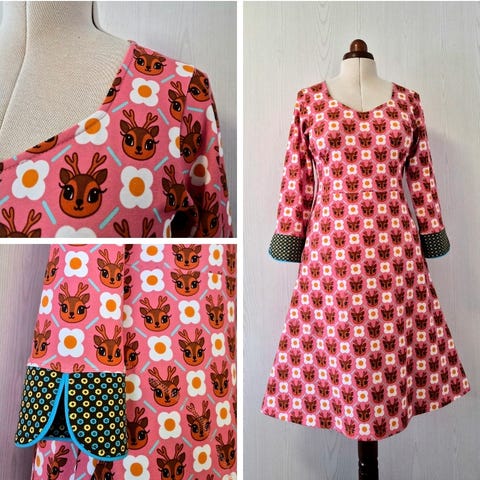 Ny kjole syet I skønt økologisk bomuldsjersey med søde havenisser og blomster. (Farverne er meget flottere i virkeligheden, kender svært at fange på kameraet) Overdelen ermed sweetheart halsudskæring og 3/4 ærmer med orange kanter. A-snit underdel med lommer.