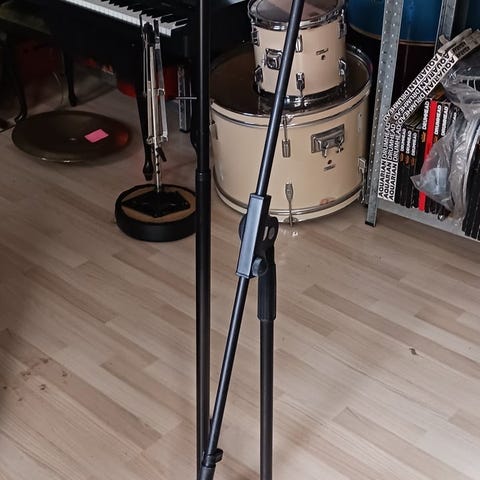 Mikrofonstativ med justerbar højde og monteret popfilter. Stativet har flere led og spænder til fastgørelse af mikrofonholder og tilbehør. Egnet til brug i hjemmestudie, podcast eller indspilning, hvor der er behov for stabil placering af mikrofon og dæmpning af poplyde.