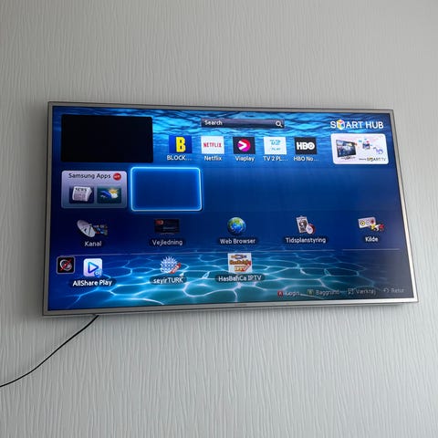 TV’et er fra 2018 og fungerer fint. Fint billede med 4K-opløsning, HDR og Samsungs Smart TV (alle apps). Google Chrome Cast medfølger også.