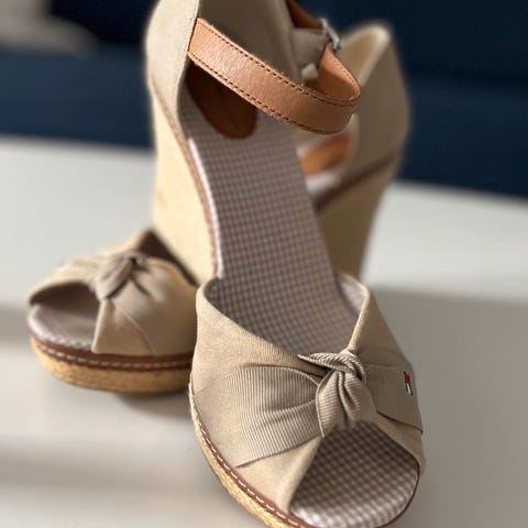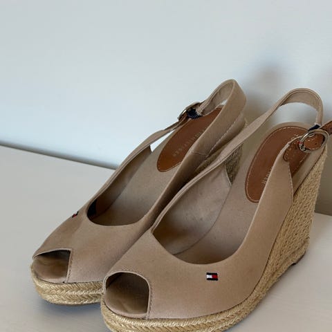 Skoene er i beige tekstil med åben tå og slingback-rem.