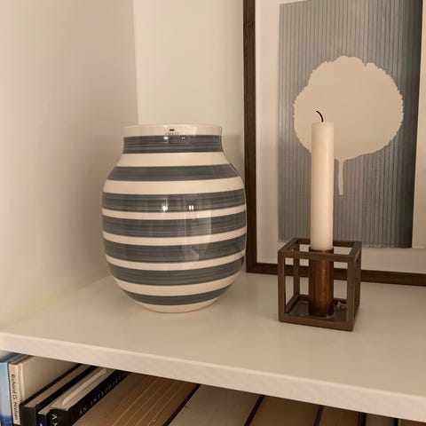 Kähler Omaggio vaser i keramik med brede, horisontale striber. Vaserne har en rund form med smal åbning foroven, velegnet til blomster eller som dekorative objekter i hjemmet. Klassisk stribet design, som kendes fra Kählers Omaggio-serie. 20 cm højde. Samlet 300 kr.