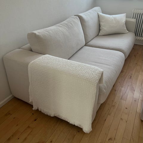3 personers sofa, meget velholdt. Der har altid været tæppe på . Sofaen er 2 år. Fra ikkeryger og dyrefrit hjem. Betræk kan tages af og vaskes. Dejlig at sidde i.