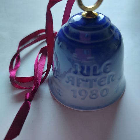Bing & Grøndahl juleklokke i porcelæn fra 1980. Klokken er dekoreret i blå og hvid med teksten "Juleaften 1980" i relief på ydersiden. Indvendigt har klokken en hvid kugleklokke ophængt i metaltråd. Velegnet som julepynt eller samlerobjekt fra Bing & Grøndahls julekollektion. Afhentes København S. - udenfor Miljøzonen