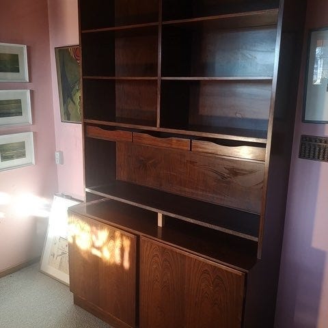 Retro reol fra 1960'erne med gennemgående sider og flytbare hylder.