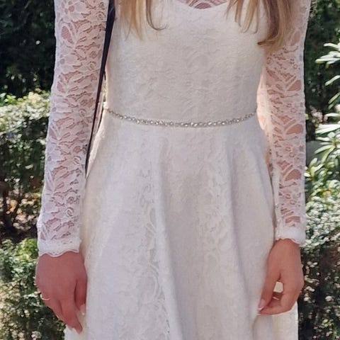 Vildt nedsat !!Den smukkeste konfirmationskjole speciel syet ved Panayotis . En blanding af Rose og Bella kjolen ved kollektion 2025 . Str 36 . Men pga båndet bag på kjolen kan den strammes efter behov . Kun brugt på selve dagen og da der skulle tages billeder af kjolen . Man er meget velkommen til at prøve kjolen inden køb . Nypris : 4175kr sælges for 1500