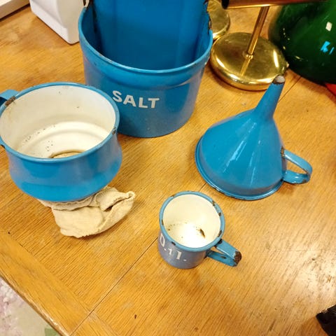 Madam blå petroleumslampe, 0,1 l mål og saltkar