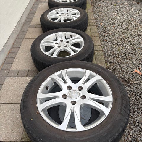 Super fine org Mazda hjul, ser næsten som nye, komplet sæt med org dæktryksventiler (TPMS) ventiler og super fine sommerdæk 215-45-18 med 7 mm mønster, stadig masser km tilbage. Hjulsættet har siddet på en Mazda 3