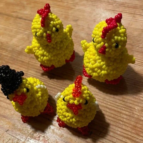 Hanehøne i hvidperle broderi med hanekam