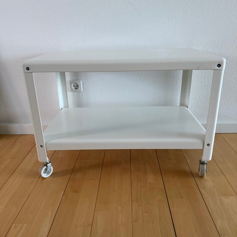 Rullebord i hvid metal med perforerede sider og top. Bordet har en åben hylde samt en stor skuffe i trælook med indvendig indsats til opdeling. Møblet står på fire hjul, som gør det nemt at flytte rundt. Velegnet som opbevaringsenhed. Køber henter selv. Prisen er til forhandling.