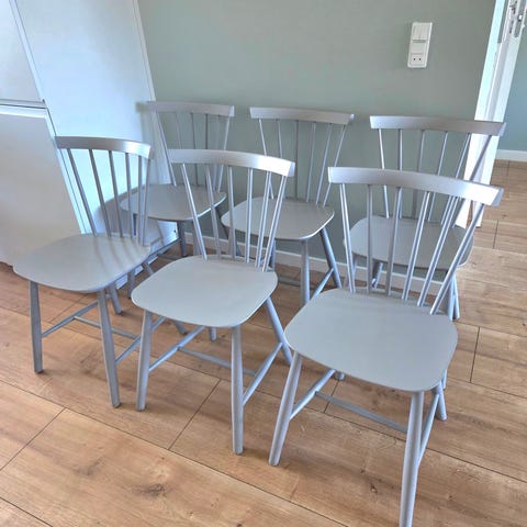 Stolene er i farven støvet grøn. De er seks år gamle. Købt fra ny.
